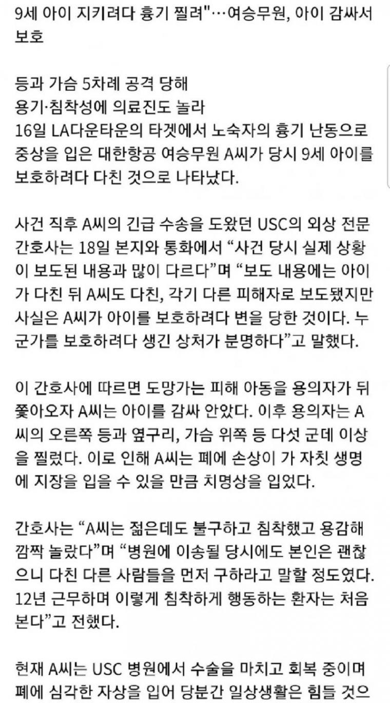 9세 아이 지키려다 흉기 찔린 대한항공 승무원
