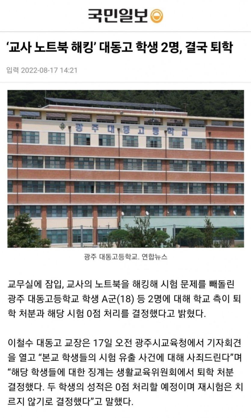 교사 노트북 해킹한 고등학생 2명 퇴학