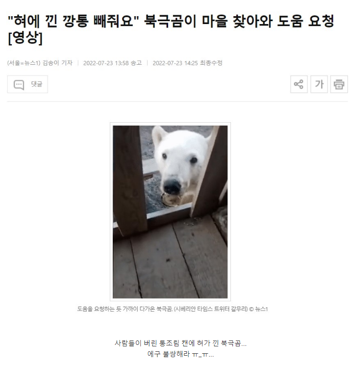 혀에 깡통이 껴 도움요청하러 마을 찾아온 북극곰