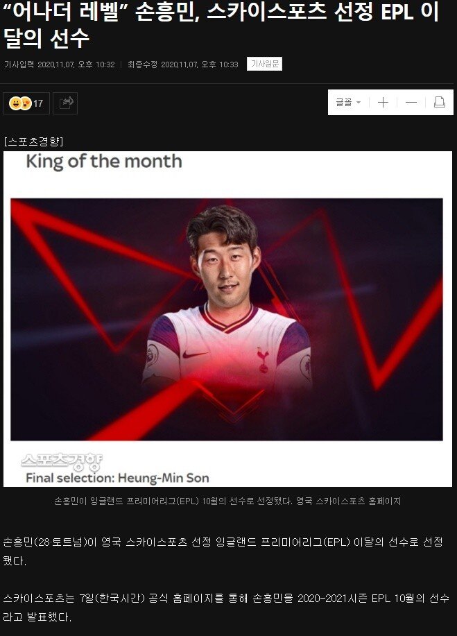 스카이스포츠는 “손흥민은 올시즌 경기력을 어나더 레벨로 끌어올렸다”며 “후보 중 가장 밸런스가 완벽한 공격수다.