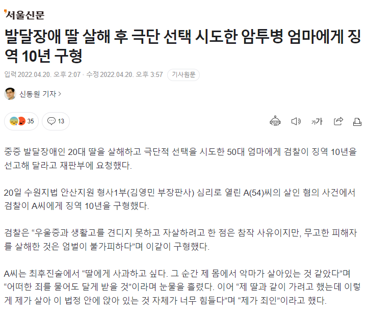 발달 장애 딸을 살해 한 후 극단적 선택 시도한 말기 암 엄마...