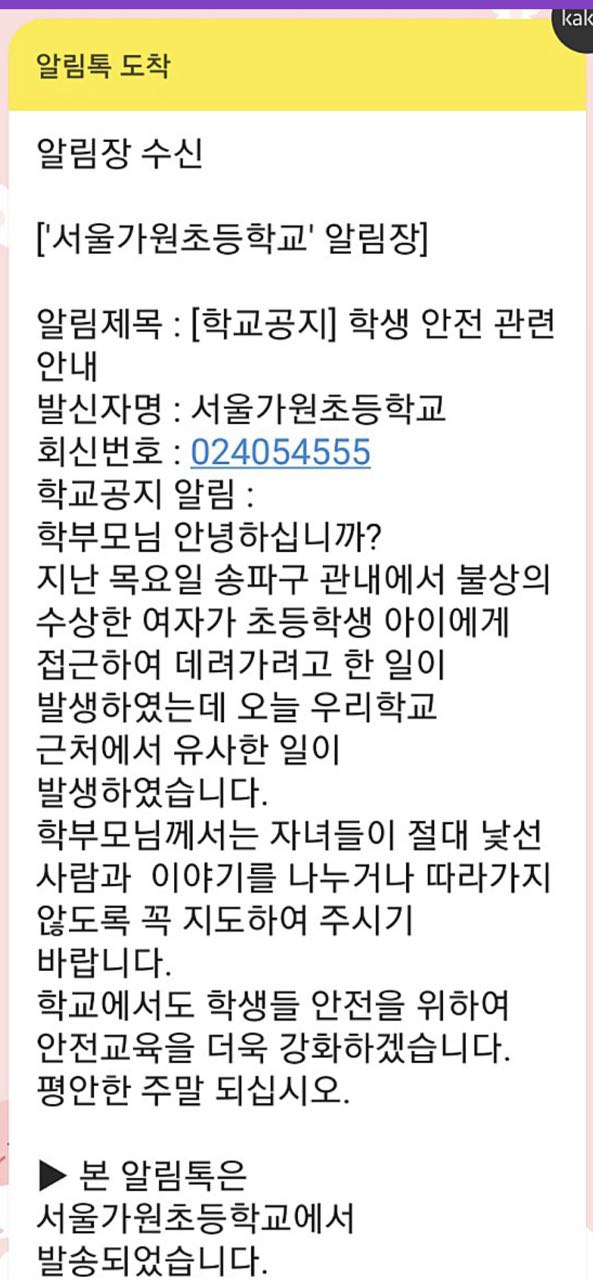 - 신원 미상의 여성이 저학년 아이들을 상대로 납치를 시도