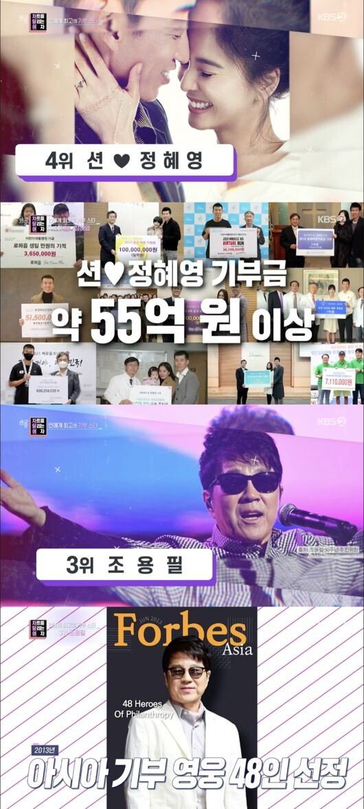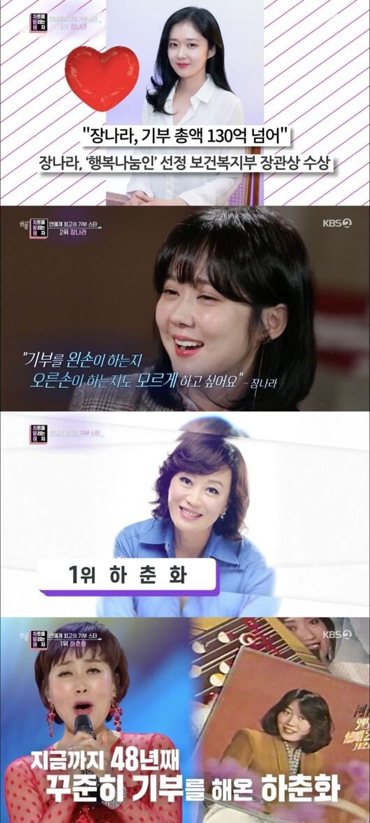 연예게 최고 기부천사 1위는 하춘화가 이름을 올렸다. 48년째 꾸준한 기부를 하고 있다는