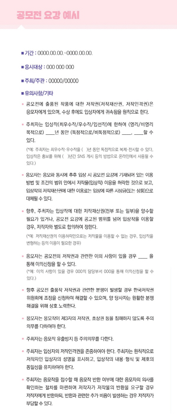한국저작권위원회 창작물 공모전 지침 ○ 공모개요 - 공정하고 균형 잡힌 저작권법 인지를 통해 문화적인 삶을 위한 문화예술과 지적인 삶을 위한 과학학술의 발전을 이룩하고자 2020년 개정된 창작물 공모전 지침을 아래와 같이 공지합니다.○ 공모전 …