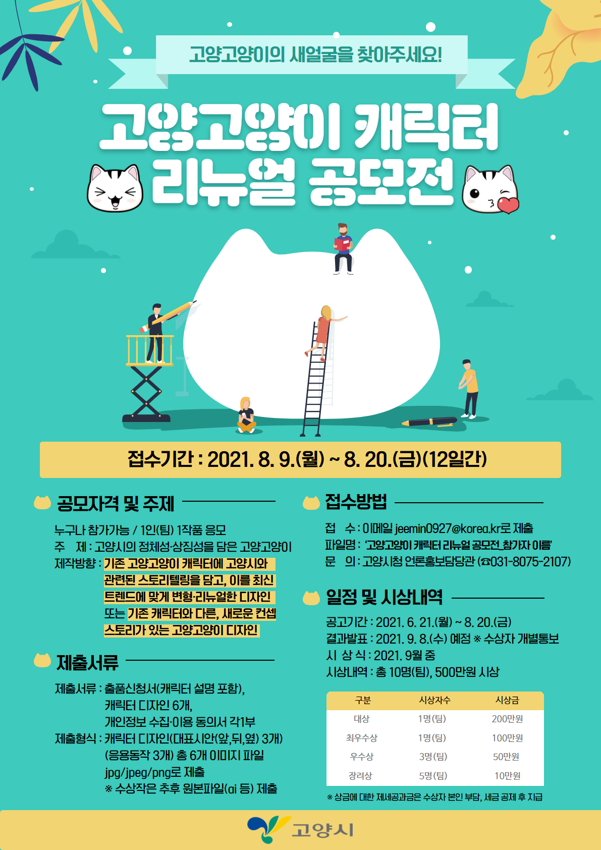 고양고양이 캐릭터 리뉴얼 공모전■ 접수기간 : 2021. 8. 9.(월) ~ 8. 20.(금)(12일간)■ 접수방법 : 이메일 접수([email protected])※ 코로나19 상황에 따른 비대면 접수 실시※ 제출파일은 ‘고양고양이 캐릭터 리뉴얼 공모전_참가자이름…