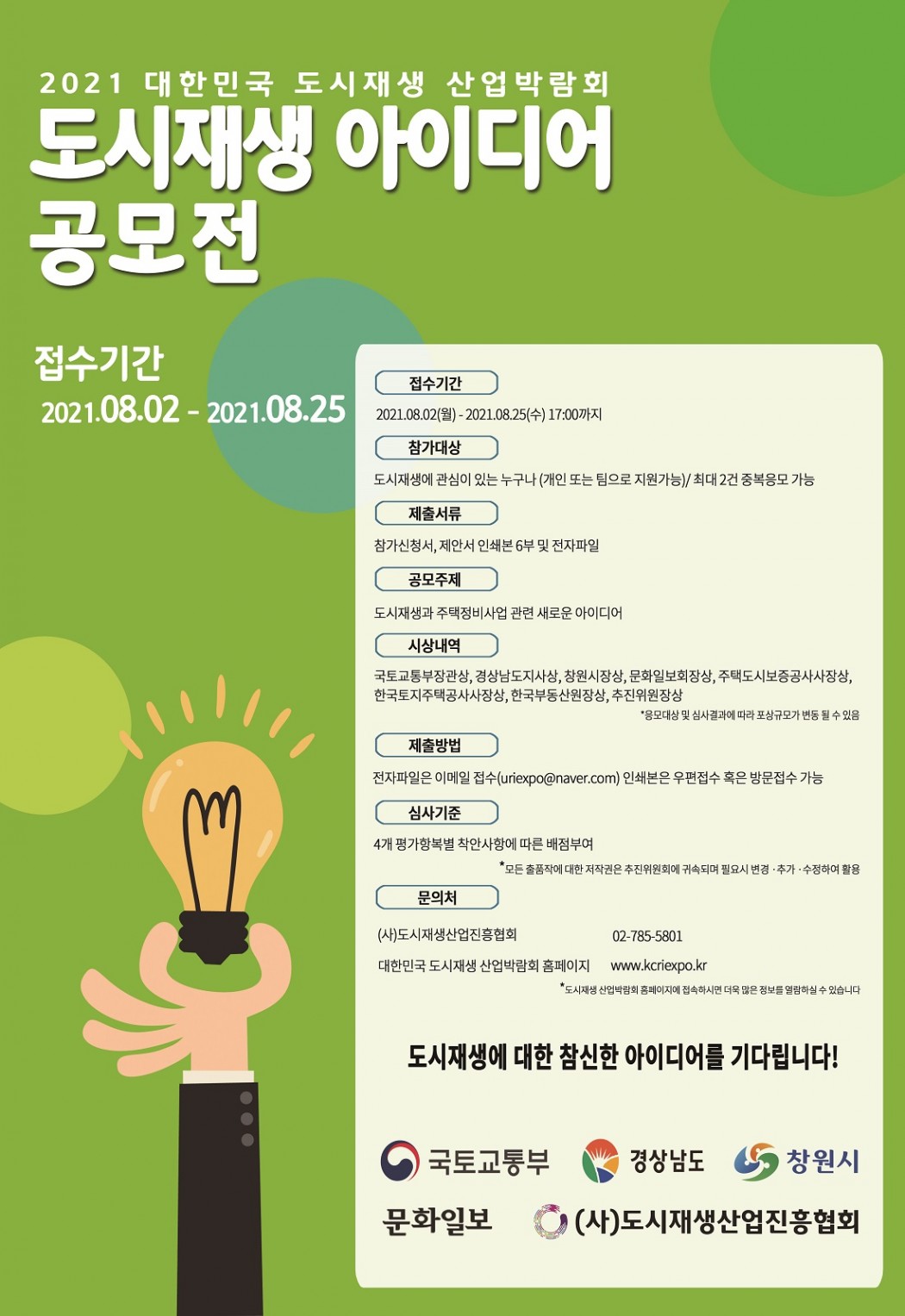2021 대한민국 도시재생 산업박람회 도시재생 아이디어 공모전■ 공모주제- 도시재생과 주택정비사업 관련 새로운 아이디어■ 접수기간 : 2021. 8. 2(월) ~ 8. 25(금) 17:00까지 ■ 제출서류- 참가신청서, 아이디어제안서(PDF파일)* 참가신청서 붙임 참…