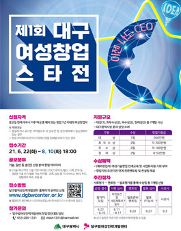 제1회 대구여성창업스타전■ 신청자격- 공고일 현재 대구시 거주 여성 중 예비 또는 창업 1년 이내의 창업자※ 개인 또는 팀(최대 3명)으로 지원가능하며 반드시 대구시 거주 여성이어야 함.※ 기 창업자의 경우 ’20.06.21 이후에 창업한 대구시 소재 여성창업자이어야 …