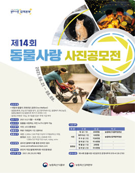 제14회 동물사랑 사진 공모전“농림축산검역본부는 ‘사람과 동물의 조화로운 공존’을 사진 작품으로 표현하고, 우수 작품을 토해 국민들의 동물보호·복지에 대한 의식을 확산시키고자 합니다.”■ 공모주제- 사람과 동물의 조화로운 공존(‘One Welfare’) * 사람과 동물…