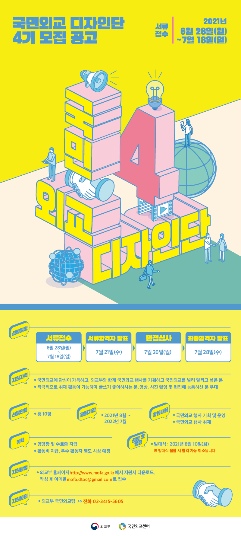 외교부 국민외교 디자인단 4기 모집■ 모집인원 : 10명■ 모집기간 : 2021년 06월 28일(월) ~ 2021년 07월 18일(일) 오후 6시까지 서류 제출■ 지원자격- 국민외교에 관심이 가득하고, 외교부와 함께 국민외교 행사를 기획하고 국민외교를 널리 알리고 싶은…