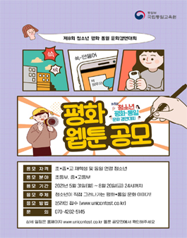 통일부 제8회 청소년 평화·통일 문화 경연대회 - 평화 웹툰 공모전통일부 국립통일교육원에서 주최하는 제8회 청소년 평화통일 문화 경연대회에서 평화 웹툰 공모전이 개최됩니다.전국의 초등학생, 중학생, 고등학생 혹은 학교밖 청소년 등 누구나 참여할 수 있는 공모전입니다.■…