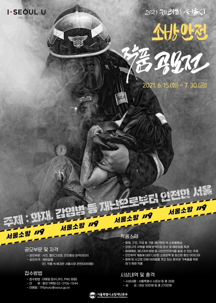 제31회 서울시 소방안전 작품공모전(사진,캘리그라피,창작이미지)서울특별시에서는 생활 속 안전의식 함양 및 안전 공감대 확산을 위해 『화재, 감 염 병 등 재난으로부터 안전한 서울』을 주제로 사진, 캘리그라피, 안전홍보 창작이미지 등 3개 부문에 대한 작품을 공모하오니 …