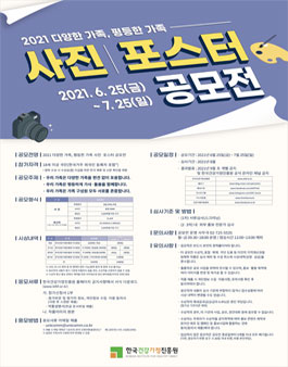 2021 다양한 가족, 평등한 가족 사진·포스터 공모전■ 참가자격 : 18세 이상 국민(한국거주 외국인 등록자 포함*)* 향후 수상 시 수상금(품) 지급을 위한 한국 체류 및 신분 확인을 위함 ■ 공모주제- “우리 가족은 다양한 가족을 편견 없이 포용합니다”- “우리 …