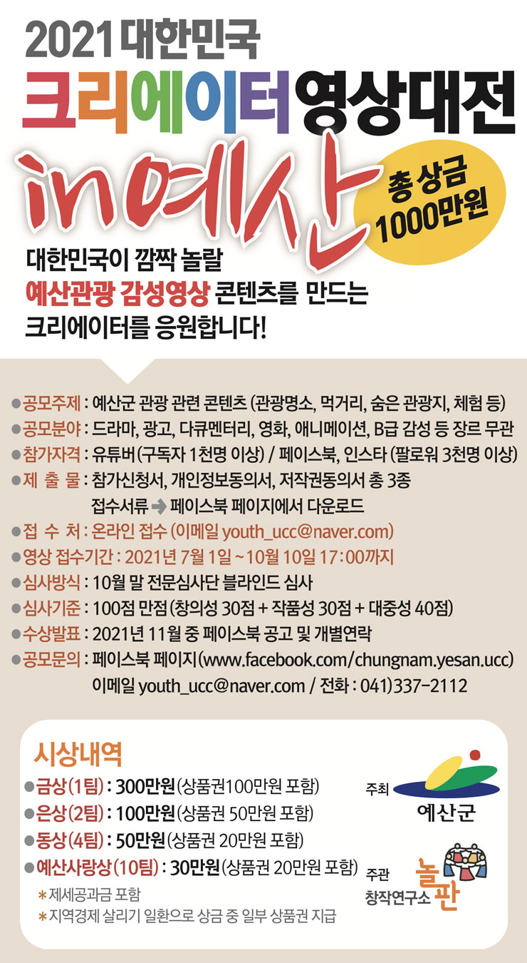2021 대한민국 크리에이터 영상대전 in 예산■ 공모 주제 : 예산군 관광 관련 콘텐츠 (관광명소, 먹거리, 숨은관광지, 체험 등_)■ 공모 분야 : 드라마, 광고, 다큐멘터리, 영화, 애니메이션, B급 감성 등 장르 무관■ 참가자격 : 유튜버(구독자 1천명 이상)…