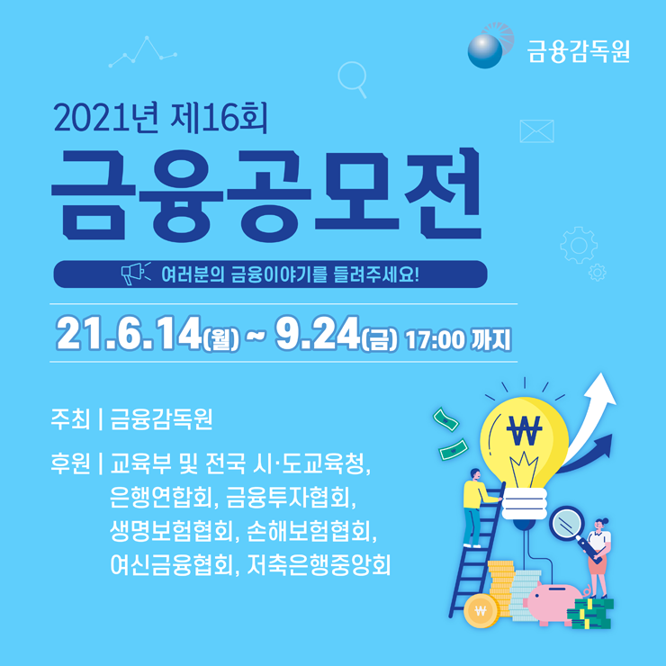 제16회 금융공모전■ 공모기간 : ‘21.6.14.~9.24.(17:00까지)■ 응모방법 : 금융감독원 금융교육센터 홈페이지로 참여신청하고, 작품은 홈페이지 또는 이메일([email protected])로 제출■ 입상발표 : ‘21.10월 하순경 입상발표, 11월 …