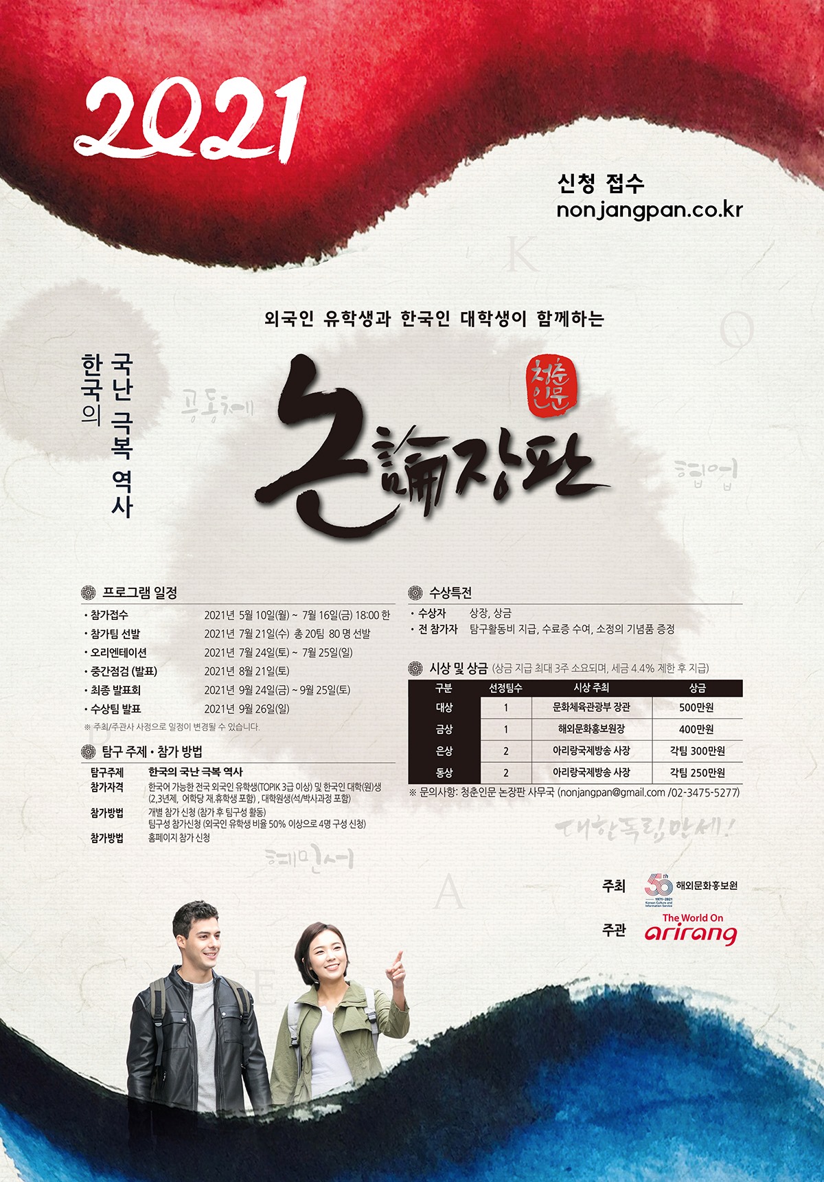 아리랑티비X문화체육관광부 2021년 청춘인문 논(論)장판 모집[아리랑티비X문화체육관광부] 2021 청춘인문 논장판! 총 2000만원의 상금과 문체부 상까지! 글로벌 대외활동주최: 해외문화홍보원주관: 아리랑 국제방송■ 프로그램- 활동: 외국인 친구들과 함께 조별 스터디 …