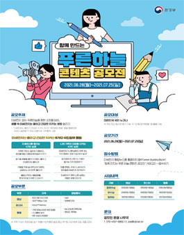 함께 만드는 푸른 하늘 콘텐츠 공모전■ 활동내용 또는 응모주제미세먼지 없는 푸른하늘을 향한 소망을 담아, 생활 속 미세먼지는 줄이고 건강은 지키는 방법 알리기※ '미세먼지는 줄이고 건강은 지키는 8가지 국민참여 행동' 등을 활용하여 국민이 공감할 수 있는 내용으로 자유…