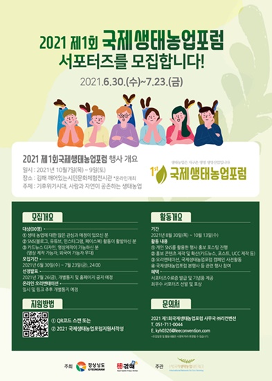 2021 제1회 국제생태농업포럼 서포터즈 모집 2021.06.30.(수) ~ 7.23(금) ○ 모집개요⏵ 모집대상 (00명)생태분야에 대한 많은 관심과 애정이 있는 분SNS (블로그, 유튜브, 인스타그램, 페이스북) 활동이 활발하신 분카드뉴스 디자인, 영상 제작…