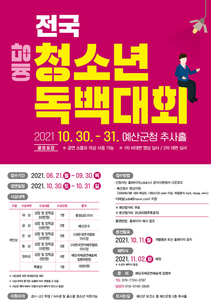 제3회 예당전국청소년독백대회 개최 및 모집■ 행사명: 예당전국청소년독백대회■ 접수기간: 2021. 6. 21(월) ~ 9. 30(금)■ 경연일정: 2021. 10. 30(토) ~ 10. 31(일)■ 지원자격: 초5~고3 학생 / N수생 및 홈스쿨 청소년 지원가능■ 접수…