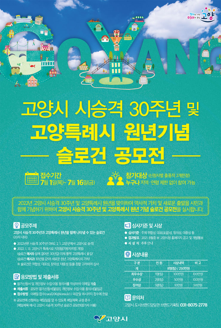 고양시 시승격 30주년 및 특례시 원년 기념 대국민 슬로건 공모전■ 접수기간 : 2021. 7. 1.(목) ~ 7. 16.(금)■ 공모대상 : 누구나(지역·연령 제한 없이 참여 가능) / 신청자별 출품작 2개 한정■ 공모주제- 고양시 시승격 30주년과 특례시 원년을 함…