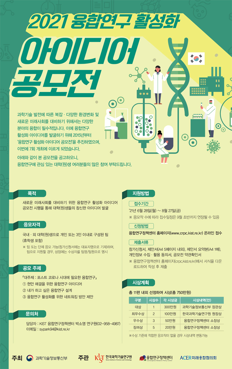 2021 융합연구 활성화 아이디어 공모전 과학기술 발전에 따른 복잡‧다양한 환경변화 및 새로운 미래사회를 대비하기 위해서는 다양한 분야의 융합이 필수적입니다. 이에 융합 연구 활성화 아이디어를 발굴하기 위해 2015년부터 ‘융합연구 활성화 아이디어 공모전’을 추진하였으…