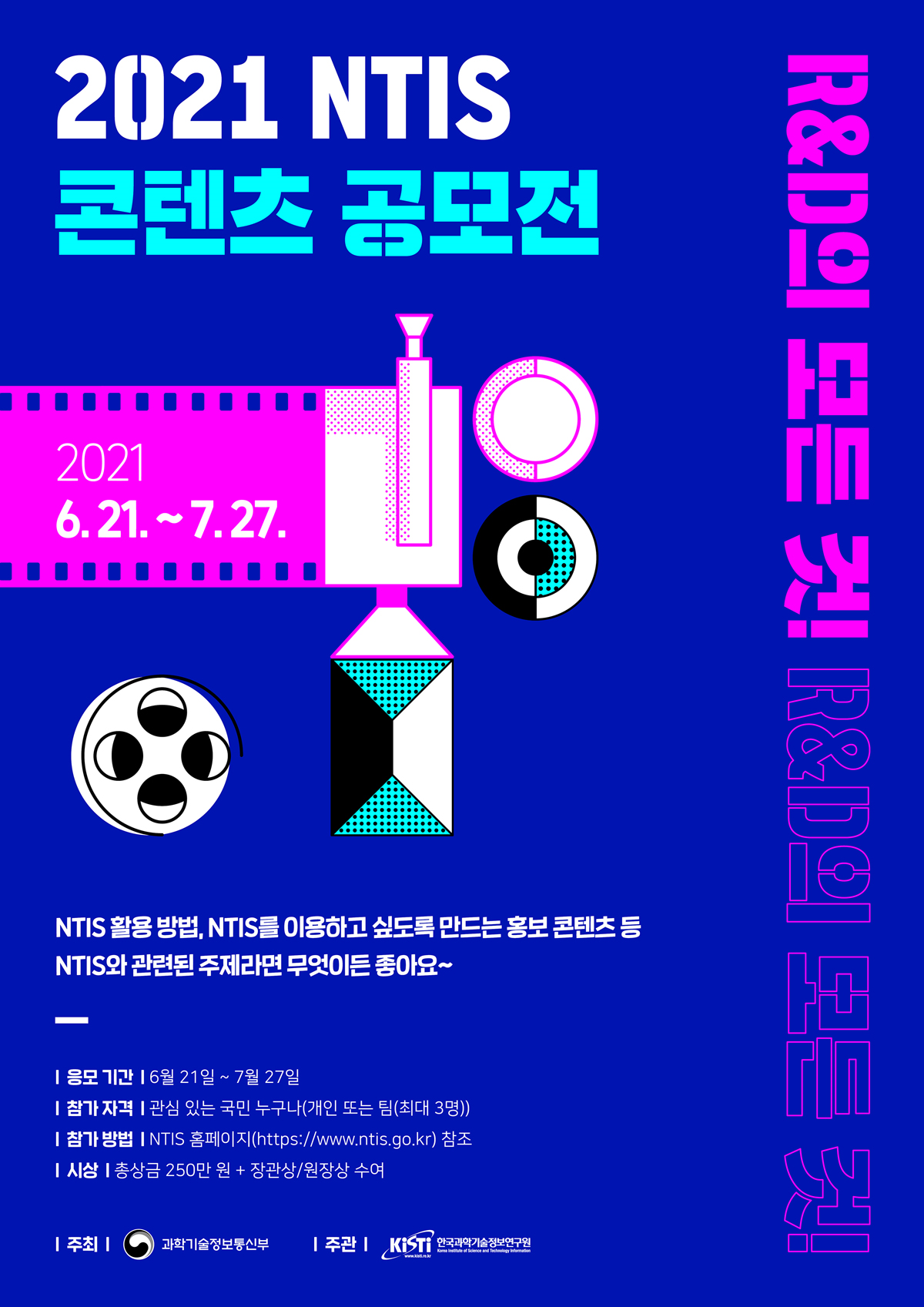 2021 NTIS 콘텐츠 공모전R&D의 모든 것! ■ 대회 주제 : NTIS 활용 방법, 홍보 콘텐츠를 카드뉴스, 웹툰, 영상 등 다양한 형식으로 제작NTIS 활용 방법, NTIS를 이용하고 싶도록 만드는 홍보 콘텐츠 등 NTIS와 관련된 주제라면 무엇이든 …