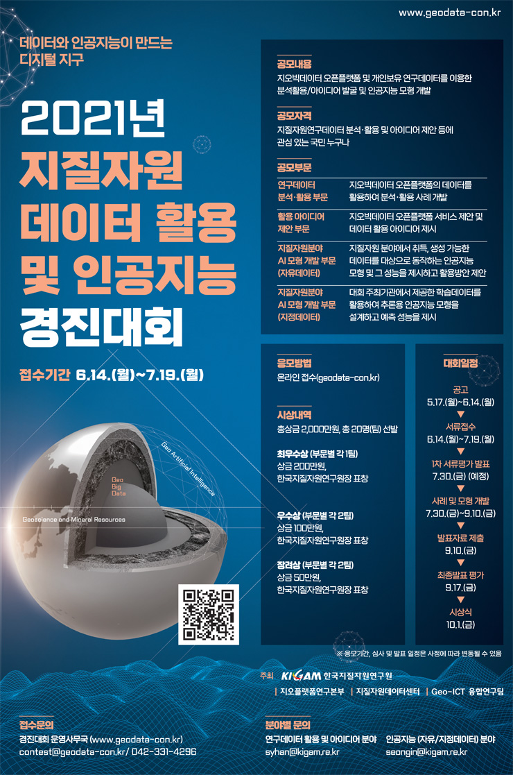 2021년 지질자원 데이터 활용 및 인공지능 경진대회■ 공모내용- 지오빅데이터 오픈플랫폼 및 개인보유 연구데이터를 이용한 분석활용/아이디어 발굴 및 인공지능 모형 개발■ 공모자격- 지질자원 연구데이터 분석·활용 및 아이디어 제안 등에 관심 있는 국민 누구나* 개인 또는…