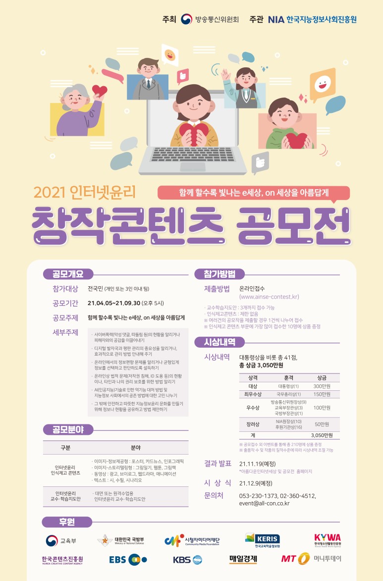 2021 인터넷윤리 창작콘텐츠 공모전 ○ 공모주제 - [함께 할수록 빛나는 e세상, on 세상을 아름답게] * (세부주제) - 사이버폭력(악성 댓글, 따돌림 등)의 현황을 알리거나 피해자와의 공감을 이끌어내기 - 디지털 발자국과 평판 관리의 중요성을 알리…