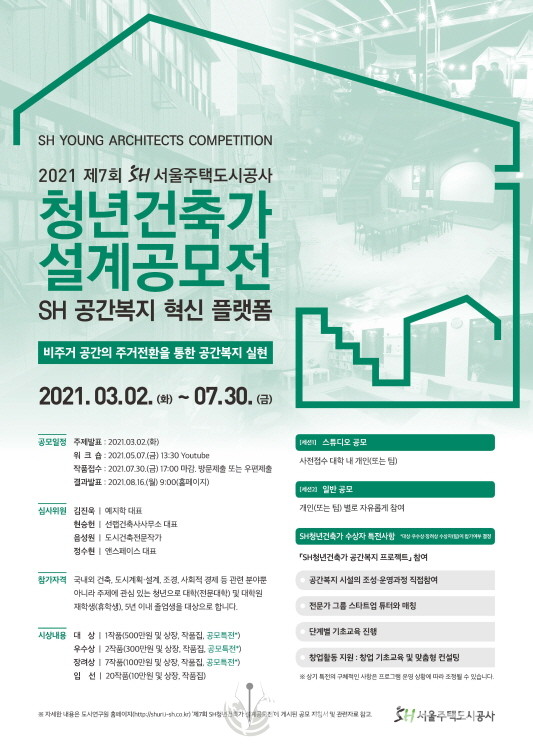 2021 제7회 SH 청년건축가 설계공모전 × SH 공간복지 혁신플랫폼○ 공모개요 - SH 공간복지란, 모든 세대와 계층에게 필요한 시설·서비스를 지역에 맞춰, 좋은 공간으로 공급하는 (SH공간복지전략실, 2019)으로 SH는 다양한 주체와의 거버넌스 구…