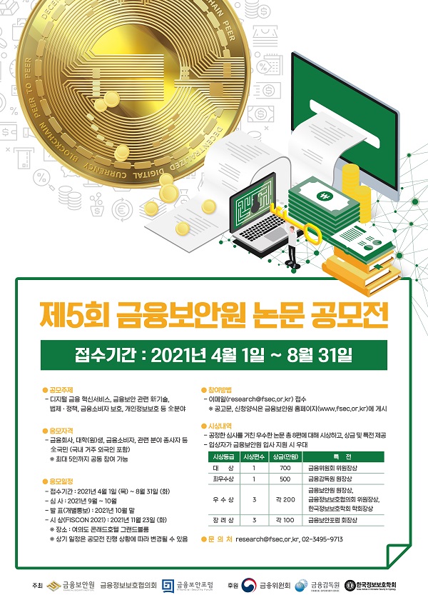 제5회 금융보안원 논문 공모전○ 공모주제 - 디지털 금융 혁신서비스, 금융보안 관련 신기술, 법제·정책, 금융소비자 보호, 개인정보보호 등 관련분야○ 기간 및 일정 - 접수 기간 : 2021년 4월 1일(목) ~ 8월 31일(화) - 발 표(개별통보) : 20…