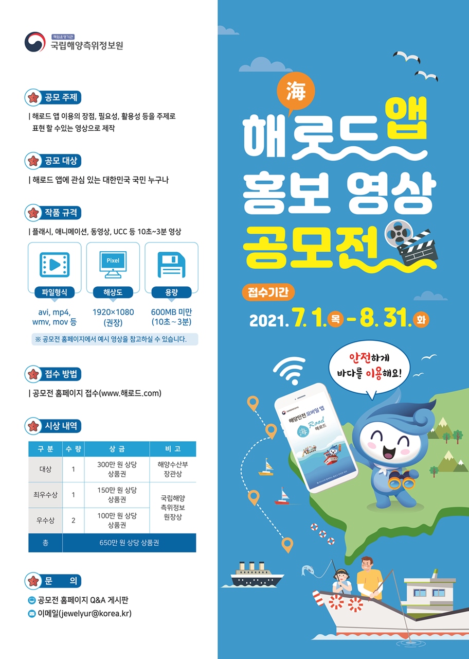 2021 해로드 앱 홍보 영상 공모전 ○ 공모개요 - 해양안전 모바일 앱 ‘해로드(海Road)’의 유효성을 널리 알리고, 이용자 확대를 위한 다양한 홍보 콘텐츠 개발 및 비대면 홍보효과를 위해 공모전 개최○ 공모주제 - 해로드 앱 이용의 장점, 필요성…