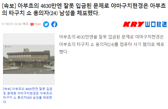 잘못 입금된 재난지원금 4630만엔 반환거부하다 결국 체포되었음