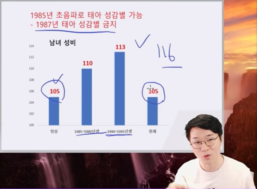 원래 남자가 여자보다 살짝 많이 태어나긴 하는데, 80년대 후반, 90년대 초반에 태어난 세대는 이상하게 남자 비율이 높음.