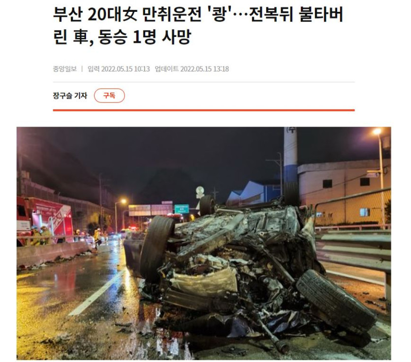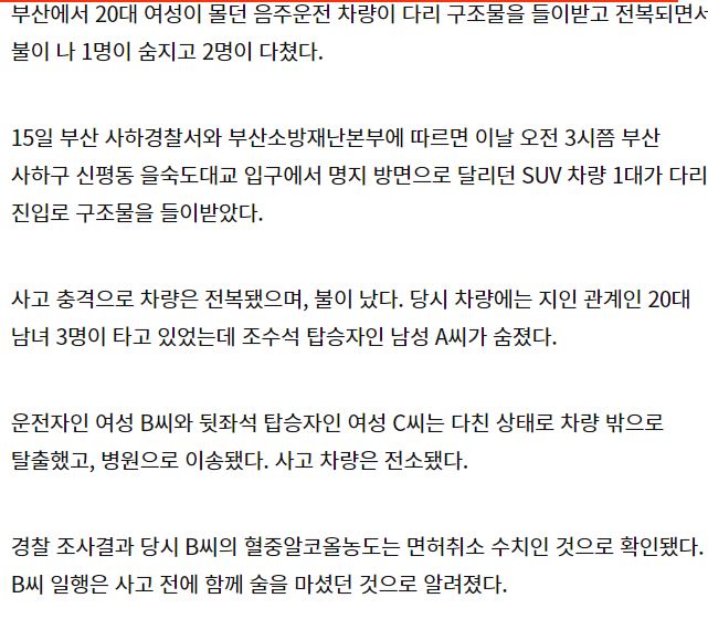 요약: 만취 여성이 차 몰았는데 구조물 박고 차에 불남 동승자 남성은 사망하고 뒷자리 동승자 ,운전자 여성들은 다침