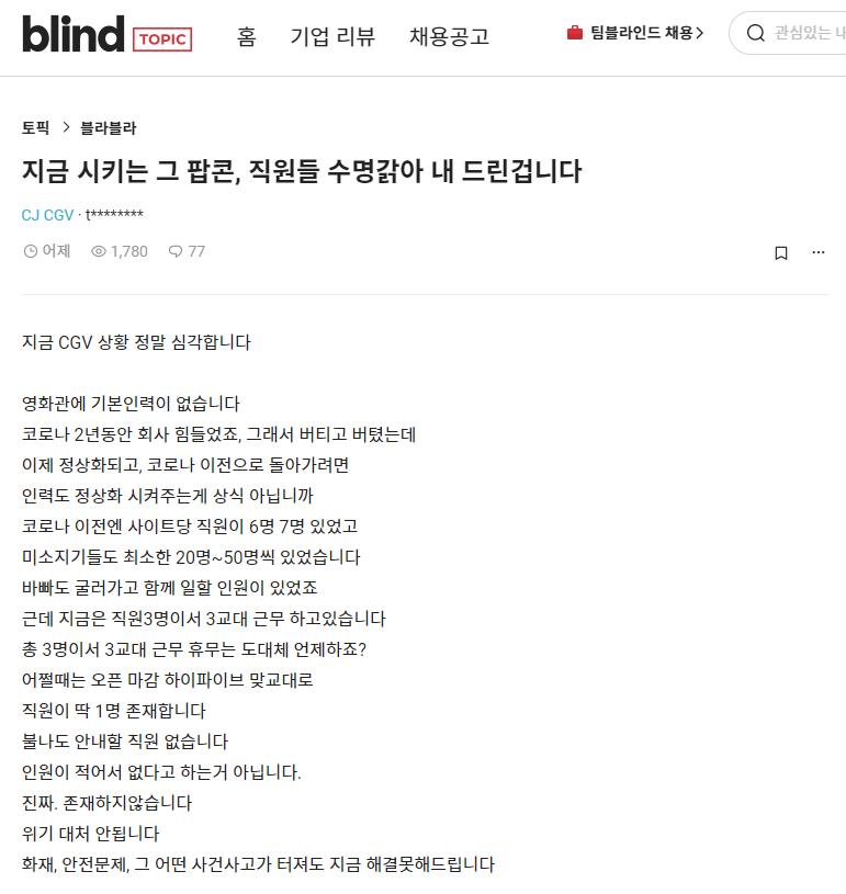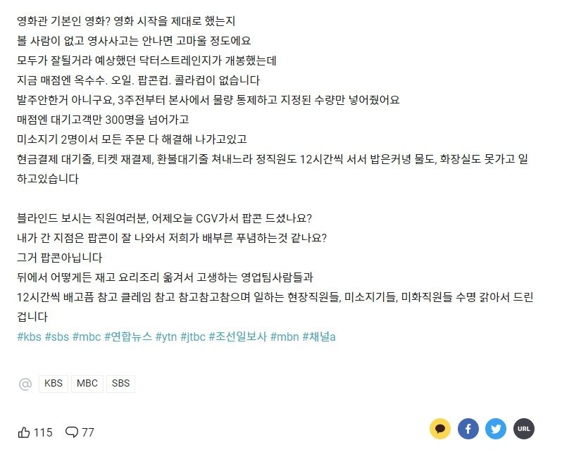 헐... 나도 얼마전에 가서 팝콘 먹었는데... 왠지 사람은 너무 많은데 직원은 없다 했어ㅜㅜ