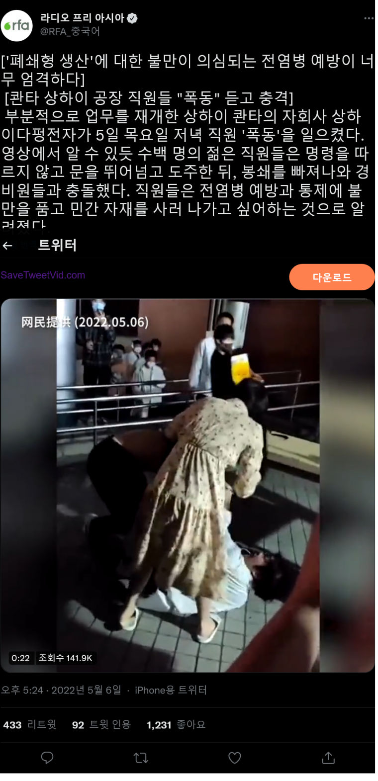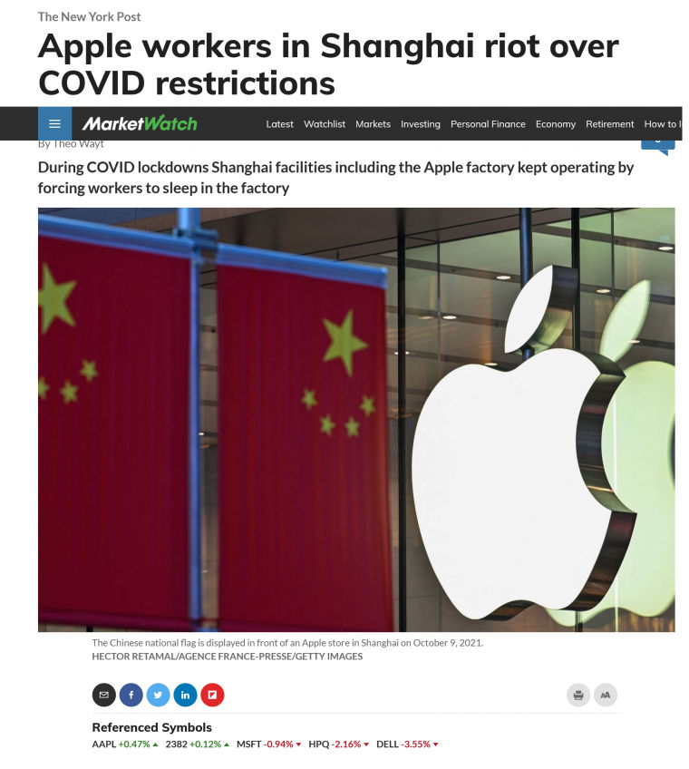 애플 제품을 만드는 상하이 공장의 공장 근로자들이 목요일 엄격한 코로나바이러스 규제에 반대하는 명백한 반란을 일으키며 방호복을 입은 경비원들과 충돌하고 보안 장벽을 뛰어넘는 폭동을 일으켰다고 소셜미디어가 보도했다.