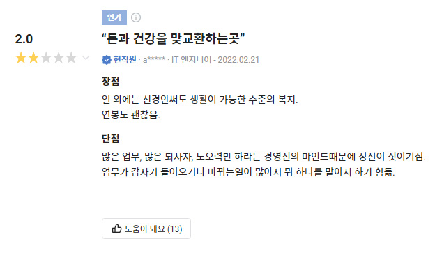 일 많고 윗대가리는 꼰머들이고 개발자 갈아 넣는 회사