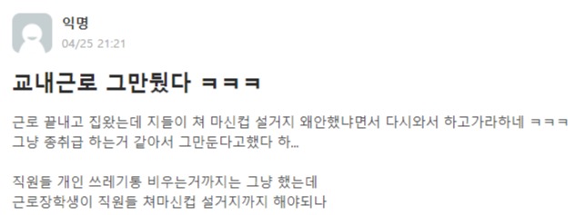 교내 장학생이 원래 잡일하는 일이다 VS. 퇴근했는데 다시 불러서 일 시키는 게 말이 되냐