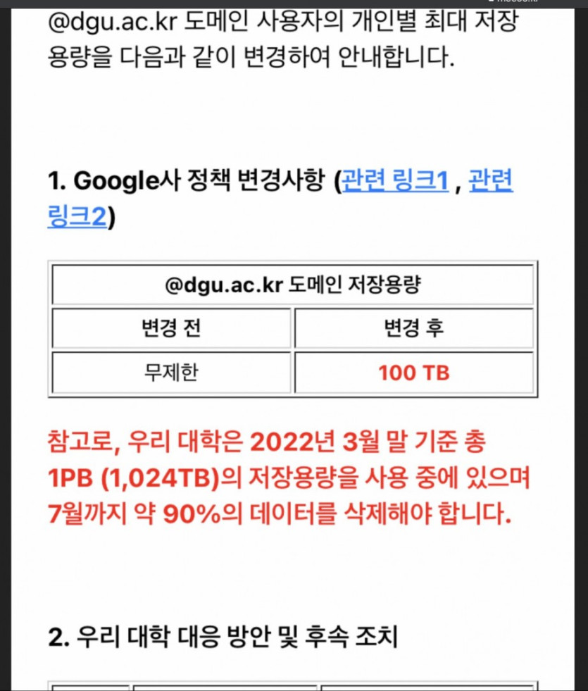 대학교 대상으로 교육용 구글 드라이브 무제한 무료 제공을 갑자기 한 대학당 100테라 바이트로 바꿔버림.