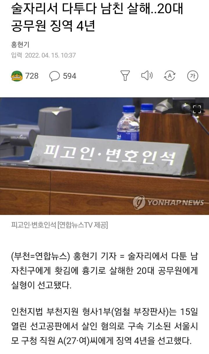 술자리서 싸우다 남친 살해한 20대 공무원 징역 4년