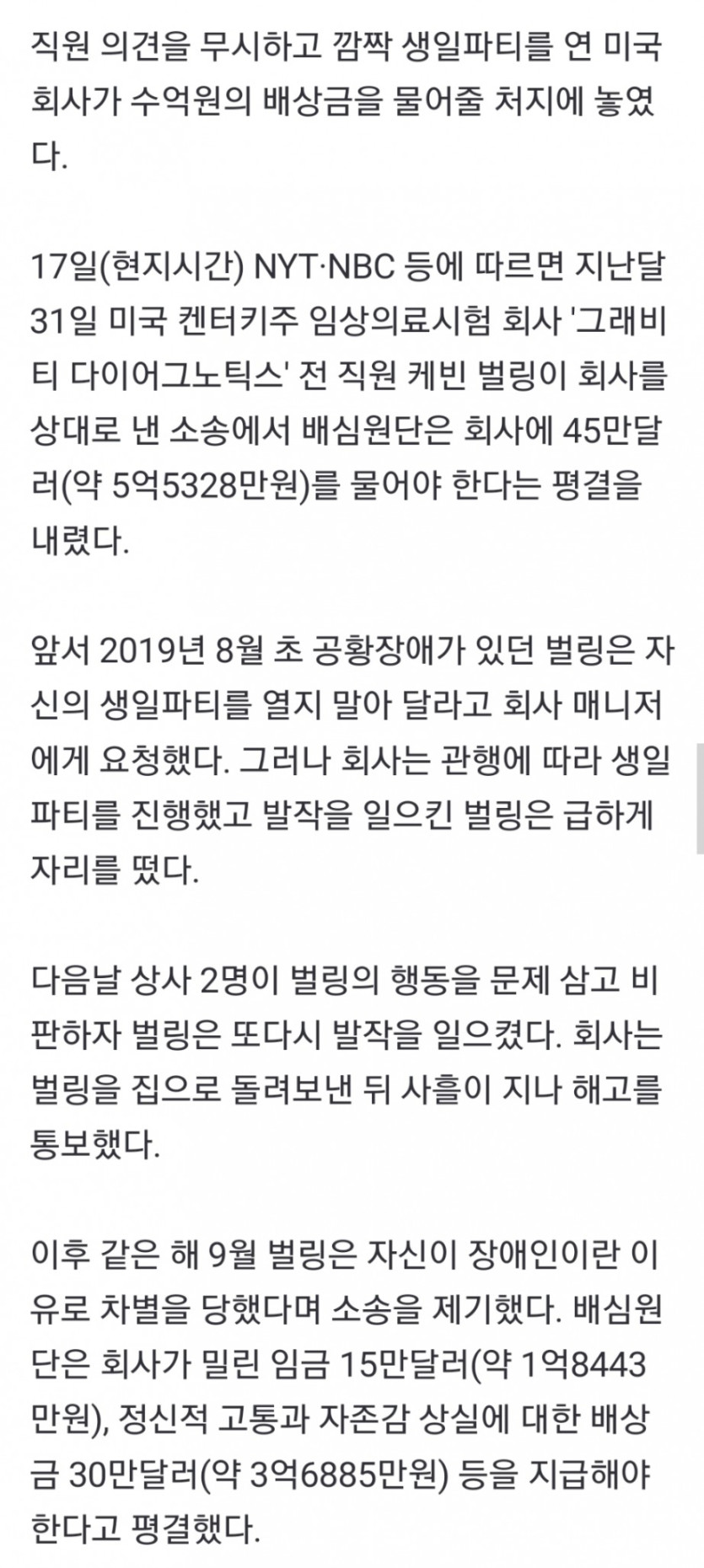 직원 깜짝 생일 파티 열었다가 5억원 물게 생긴 미국 회사