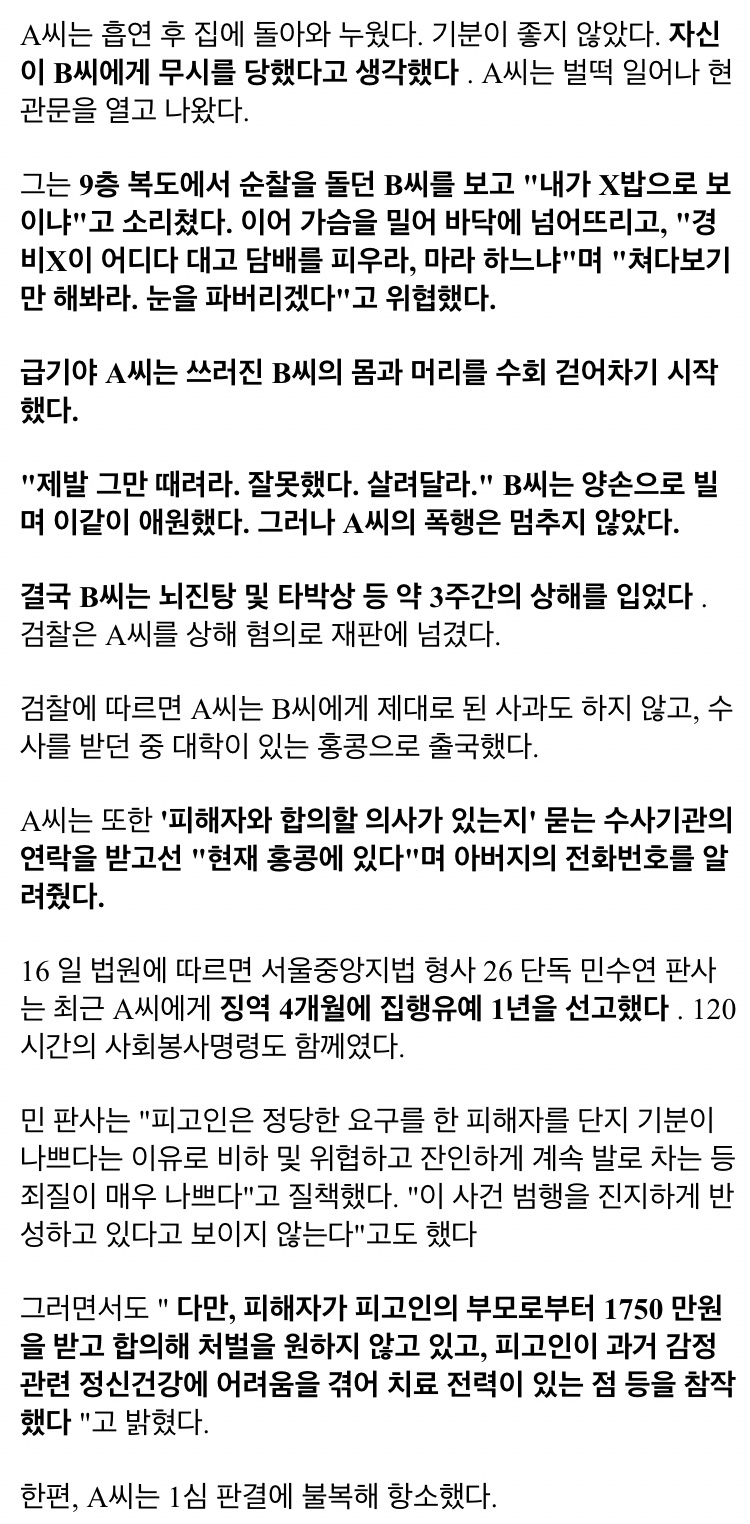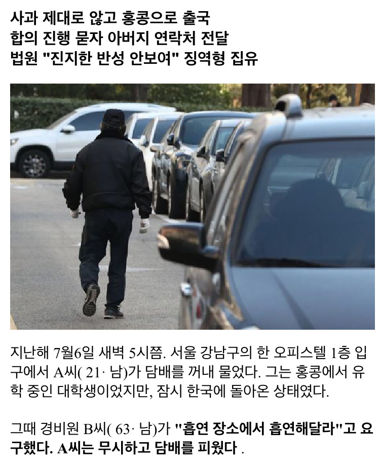 흡연장 가서 담배피라고 했다는 이유로 경비원 무자비 폭행한 21세 유학생