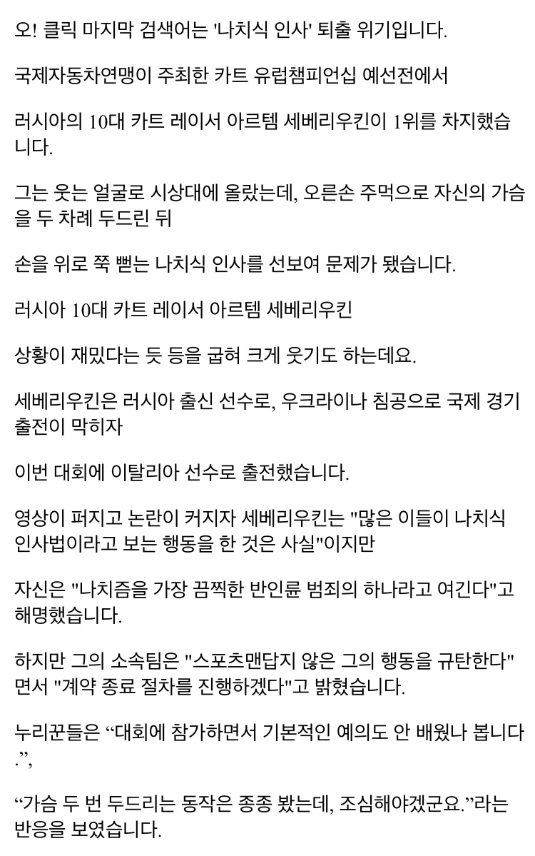 나치식 인사하고 깔깔거리는 러시아 카트 선수...