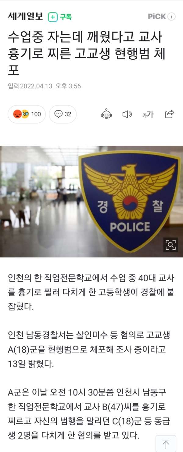 흉기로 교사 찌른 고등학생 현행범으로 체포 됨