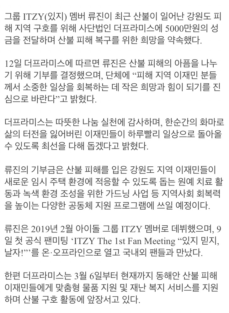 와... 잇지 류진이 동해안 산불 피해 성금 5000만원 기부했네요!
