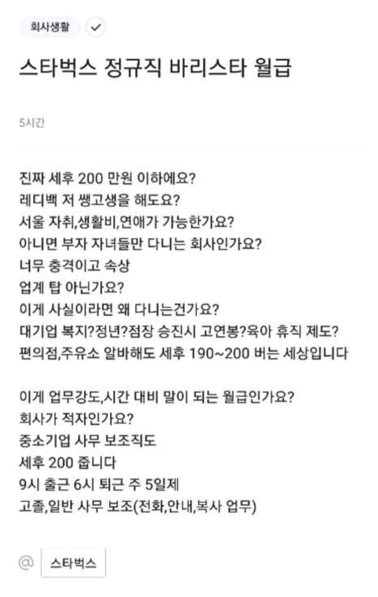 생각보다 낮은 스벅 바리스타 월급(참고로 스벅은 100퍼 정규직)