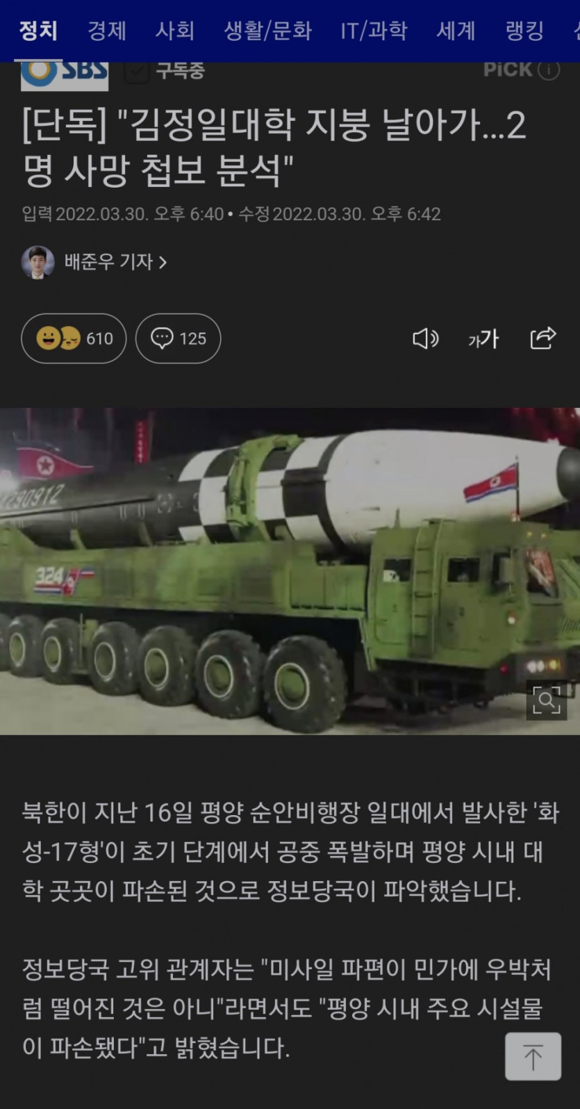 북한 ICBM 폭발로 김정일 대학 지붕 파손 및 두명사망