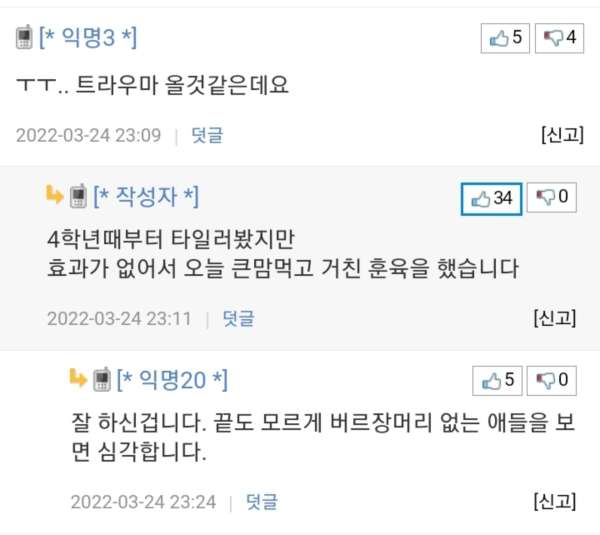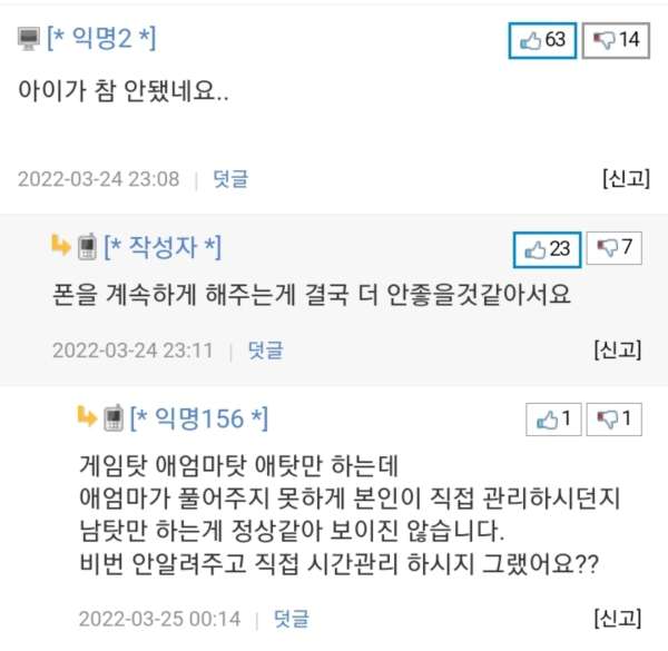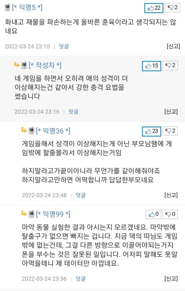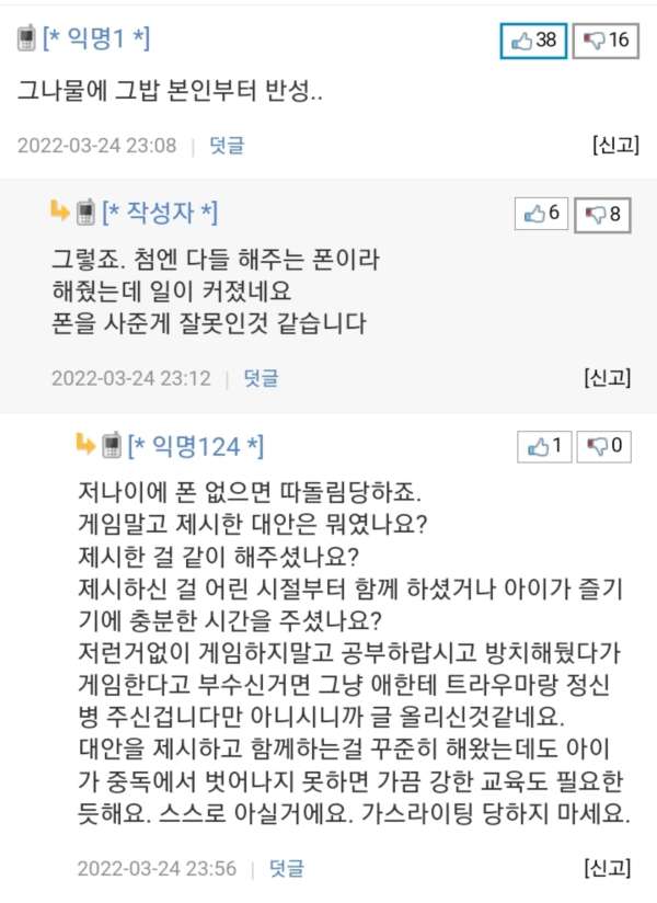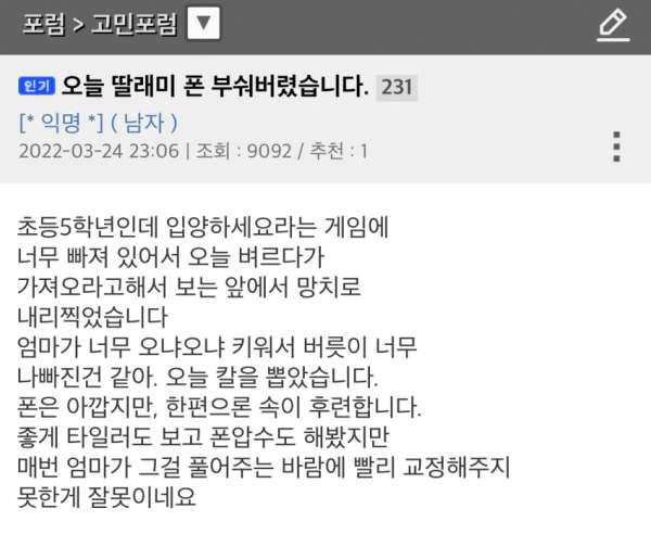 딸이 게임에 너무 빠져 폰을 망치로 부순 아빠와 댓글