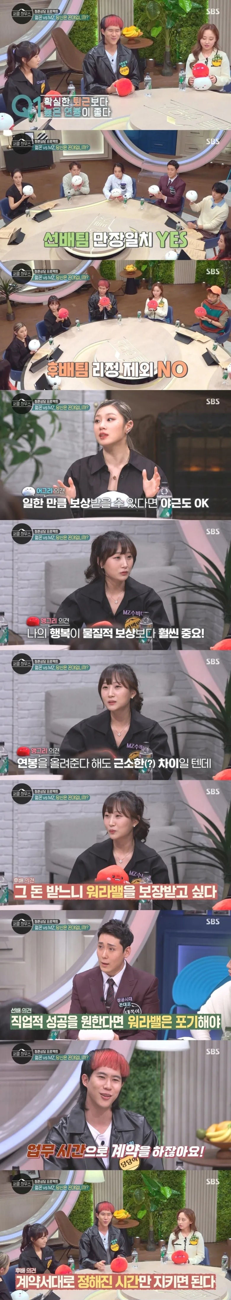 높은 연봉 vs 확실한 퇴근으로 토론하는 선배팀과 후배팀
