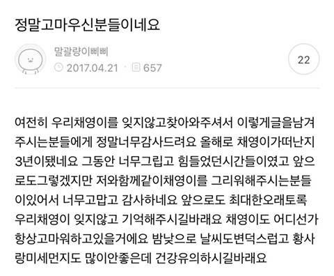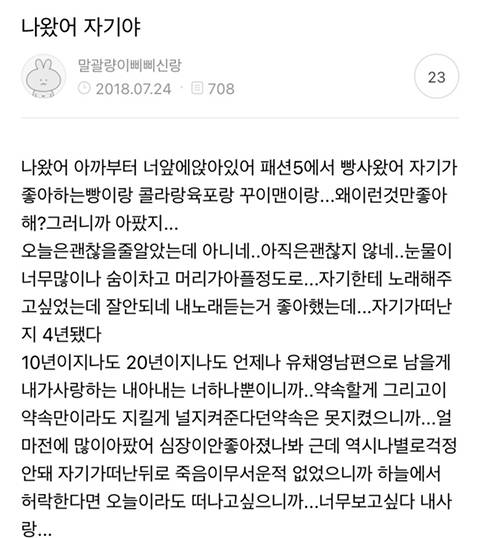 아내가 세상을 떠난 후에도 팬카페에 글을 쓰는 유채영 남편...