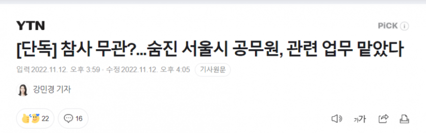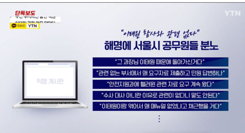 서울시 익명 게시판에는 '과장님은 이태원 때문에 돌아가셨다'거나 '관련 없는 부서가 왜 요구자료를 제출하고 민원 답변을 하느냐'는 글이 줄을 잇고 있습니다.